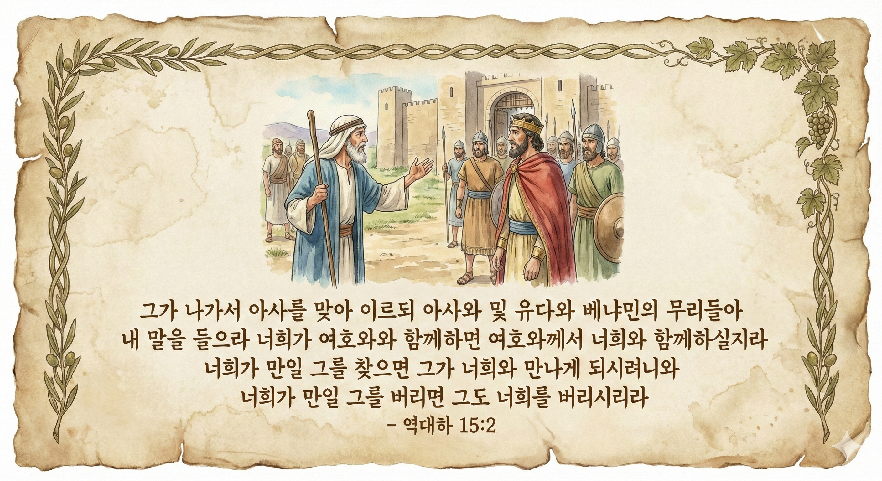 성경 구절: 역대하 15:2 "아사랴가 나가서 아사를 맞아 이르되 아사와 유다와 베냐민의 무리들아 내 말을 들으라 너희가 여호와와 함께 하면 여호와께서 너희와 함께 하실 것이요 너희가 만일 그를 찾으면 너희가 만날 것이요 만일 그를 버리면 그도 너희를 버리시리라"