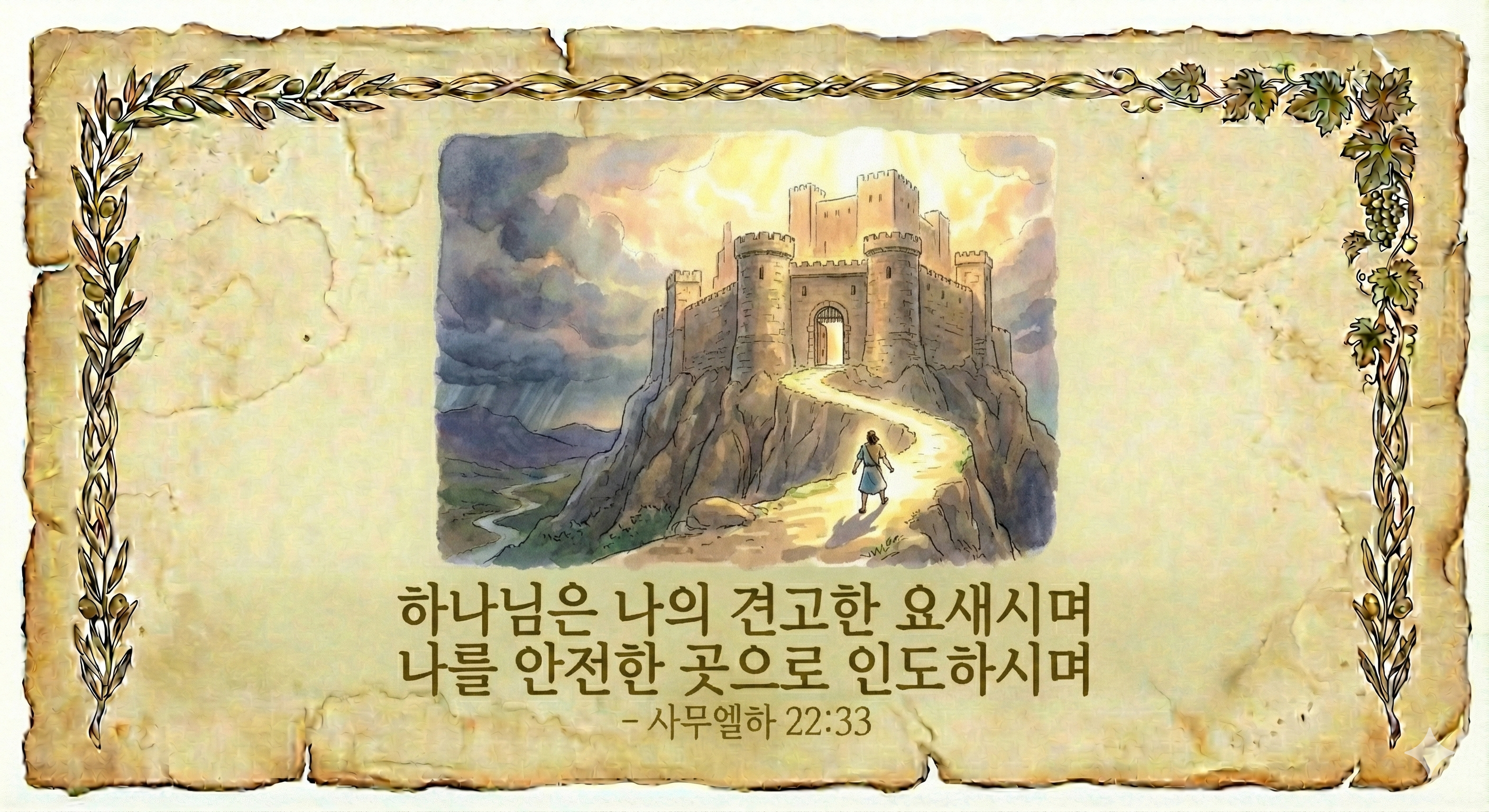 성경 구절: 사무엘하 22:33 "하나님은 나의 견고한 요새시요 나를 온전한 곳으로 인도하시며"