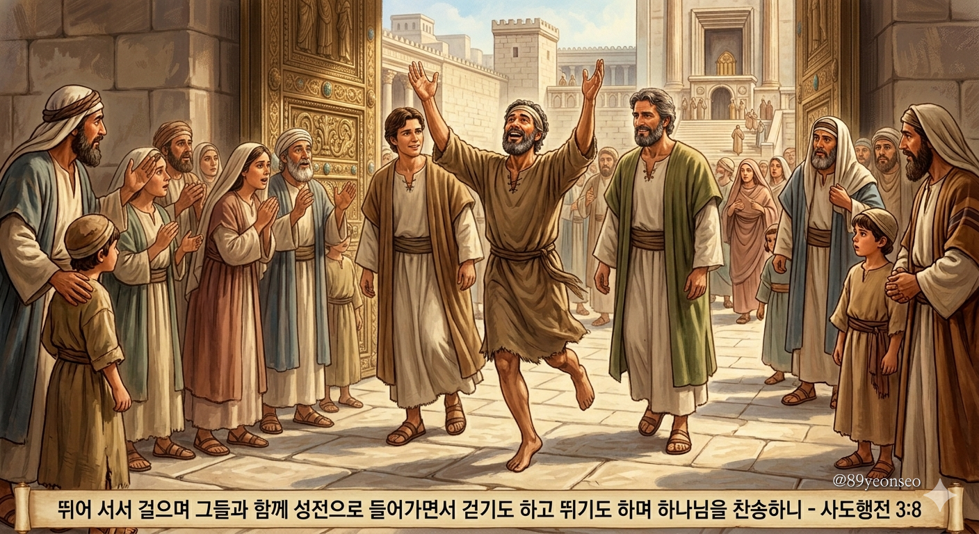 뛰어 서서 걸으며 그들과 함께 성전으로 들어가면서 걷기도 하고 뛰기도 하며 하나님을 찬송하니
